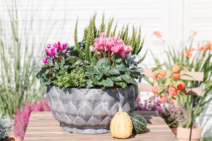 Cyclamen persicum 'Out-Land'® Auf hohe Rollen gestellt und mit einer dekorativen Platte versehen, können Sie einen alten Blumenkübel auch zu einer neuen Rolle als Truhentisch in Ihrem Garten verhelfen. Dabei spielt es keine Rolle, ob es sich um einen runden oder eckigen Kübel handelt, passen Sie einfach Ihre Tischplatte entsprechend an. Und wenn Ihnen das Äussere Ihres Kübels gar nicht mehr gefallen sollte, so können Sie mit Folien, Leisten, Stöckchen, Kieseln, Fliesenbruch, Spiegeln und vielen anderen Materialien sehr viel bewirken. Zum Befestigen können Sie, je nach Material Heisskleber, Fliesenkleber, Schmuckkordeln und -Bänder oder auch Draht verwenden. Selbst Bast und Streifen aus Kunststofftüten können kreative Akzente setzen.