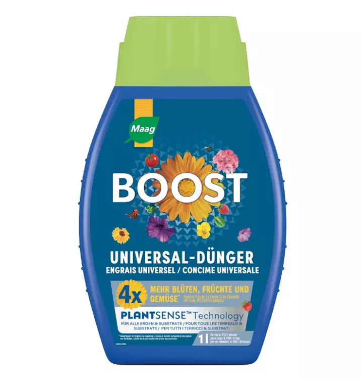 Boost Universal ist ein Flüssiger anorganischer Mehrnährstoff-Makronährstoffdünger mit Spurennährstoffen mit allen wichtigen Haupt- und Spurennährstoffen sowie wenig Seegras-Extrakt zum Verdünnen und Giessen oder sprühen als Blattdüngung für blühende Topf- und Containerpflanzen, Beeren und Gemüse. PlantSense™-Technologie sorgt für beschleunigte horizontale und vertikale Wasserverteilung, leichtere Nährstoffverfügbarkeit in allen Erden und Substraten für gesundes Wachstum mit 4-mal mehr Blüten und Ertrag.