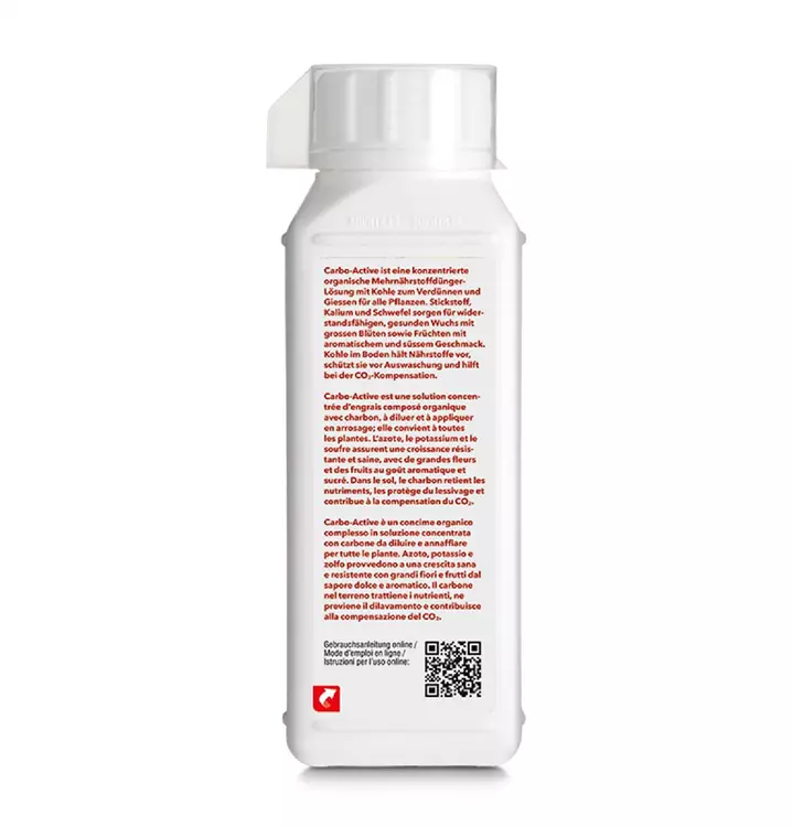 Carbo-Active ist eine konzentrierte organische Mehrnährstoffdünger-Lösung mit Kohle zum Verdünnen und Giessen für alle Pflanzen. Stickstoff, Kalium und Schwefel sorgen für wiederstandsfähigen, gesunden Wuchs mit grossen Blüten sowie Früchten mit aromatischen und süssem Geschmack.