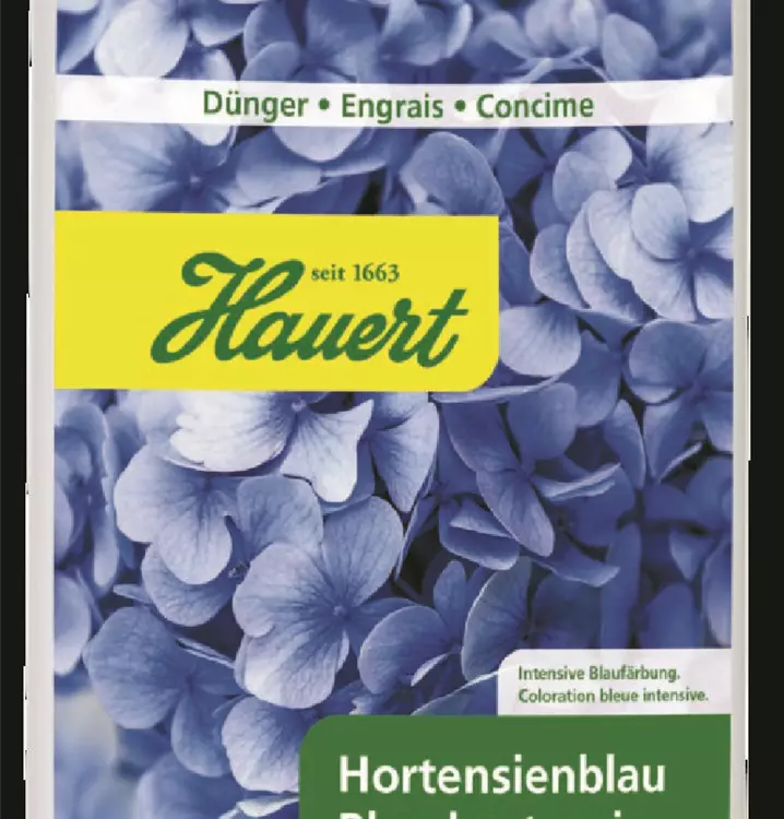 Giesswasserzusatz mit Alaun zum Blaufärben von Hortensienblüten. Hauert Hortensienblau bewirkt schön blaue Blüten. Für die Ernährung der Hortensien eignen sich Hauert Rhododünger oder Hauert Tardit Langzeitdünger vorzüglich.