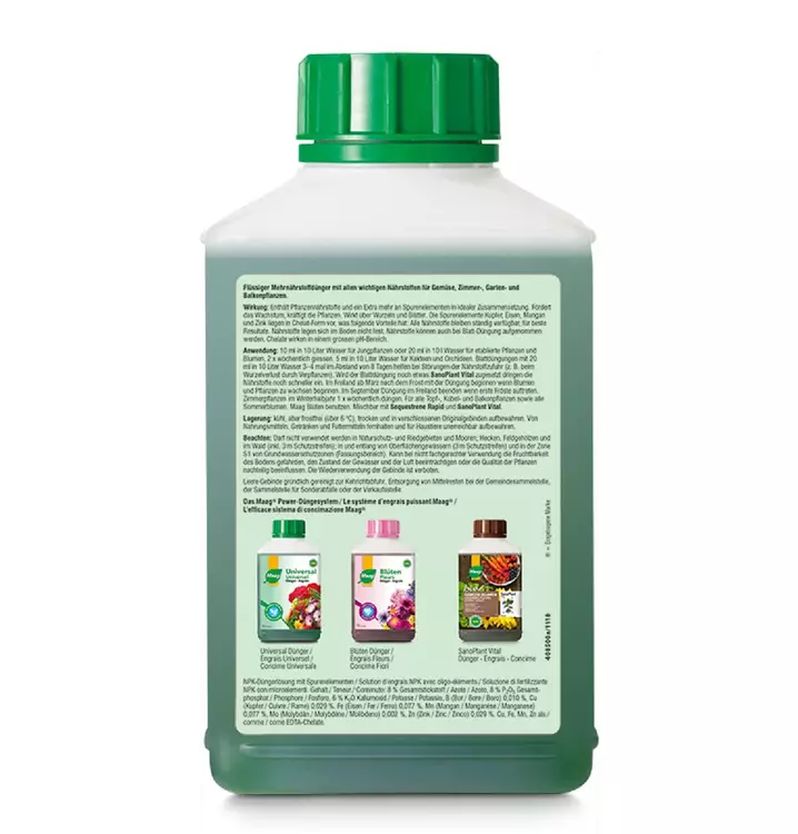 Flüssiges Mehrnährstoffdünger-Konzentrat zum Verdünnen und Giessen mit allen wichtigen Nährstoffen für alle Pflanzen in Haus und Garten.
