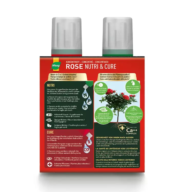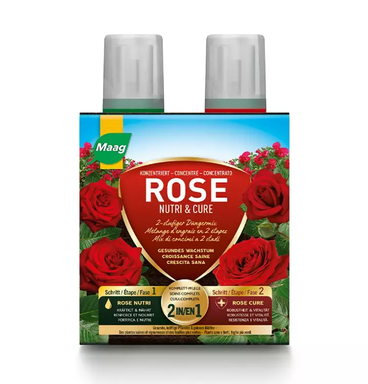 Rose Nutri und Rose Cure sind konzentrierte mineralische Mehrnährstoffdüngerlösungen zum Verdünnen und Giessen für Rosen.