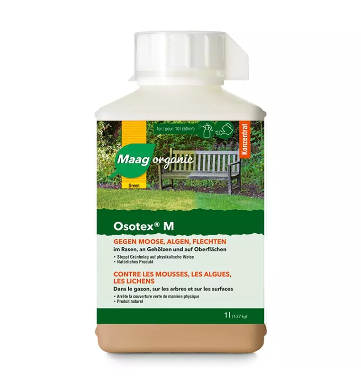 Osotex M bildet eine physikalisch wirkende Beschichtung um Moose abzutöten. Voraussetzung für den Wirkungseintritt ist das Antrocknen der Spritzbrühe. Vorbeugend eingesetzt bildet es eine Schutzschicht, die das Wachstum von Moosen verhindert. In den meisten Fällen sind die Ergebnisse nach einigen Tagen sichtbar. Bei trockenem Wetter im Sommer kann eine Anwendung weniger effektiv sein.