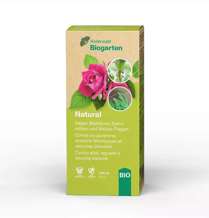 Natural enthält Kaliumsalze natürlicher Fettsäuren und wirkt gegen Blattläuse, Spinnmilben und Weisse Fliegen. Die Behandlung mit Natural ist biologisch und wirkt sofort. Anwendung bei Beeren, Obst, Gemüse, Kräutern, Zierpflanzen. Nützlingsschonend und daher sehr gut kombinierbar mit einem Nützlingseinsatz, z. B. Adalia Marienkäferlarven (aber nicht mit Raubmilben).