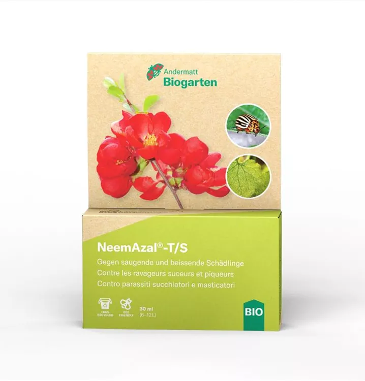 Gegen saugende, beissende und minierende Schädlinge (Blattläuse, Spinnmilben, Thrips, Weisse Fliegen, Zikaden, Minierfliegen, Kartoffelkäfer, Kastanienminiermotten, Spargelkäfer) Obstbäume: vor oder nach der Blüte, spätestens Ende Mai. Gemüse- und Zierpflanzen: 2–3 Behandlungen im Abstand von 5–10 Tagen. Rosskastanie und Gehölze: Anfang Mai. Inhalt / Zusammensetzung: Azadirachtin A