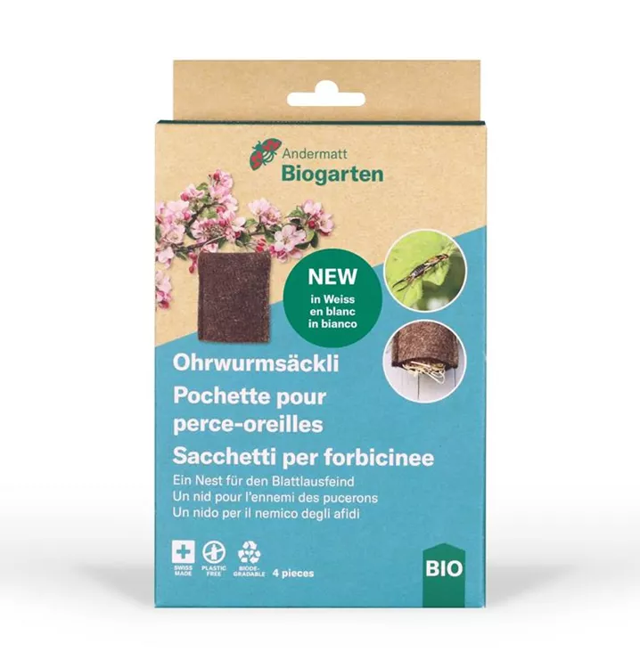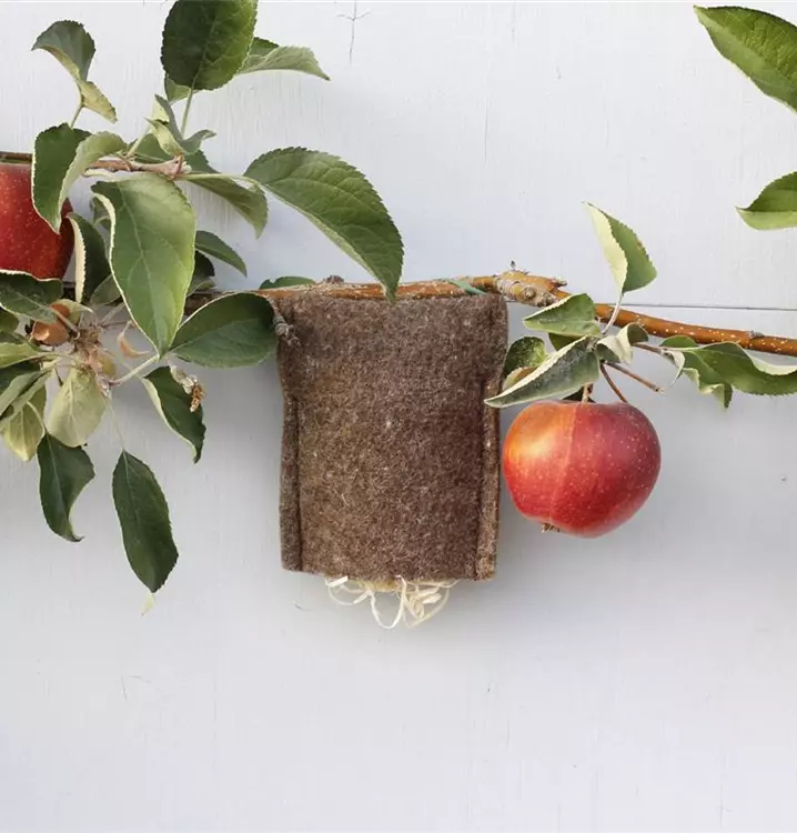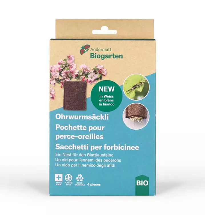 Tagesversteck für Ohrwürmer. Das Ohrwurmsäckli aus Schweizer Schafwollfilz ist mit Holzwolle befüllt und bietet Ohrwürmern ein Tagesversteck bzw. von Frühjahr bis Herbst eine warme, trockene Behausung. Ohrwurmsäckli im Frühling mit dem Draht locker an einem Ast oder Trieb von Bäumen und Sträuchern anbringen. Eine Umsiedelung von bereits bewohnten Ohrwurmsäckli an einen anderen Standort – vorzugsweise in die Nähe von Blattlauskolonien – ist möglich. Je nach Grösse des Strauches oder Baumes zwei oder mehr Ohrwurmsäckli anbringen. Inhalt / Zusammensetzung: