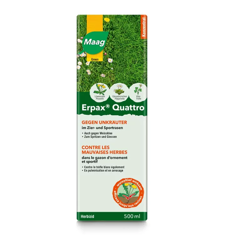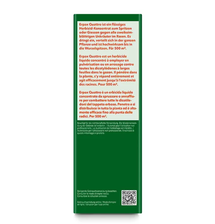 Erpax Quattro enthält 4 Wirkstoffe. Damit sorgt das Produkt für ein sehr breites Wirkungsspektrum gegen Unkräuter in Rasenflächen. Die Wirkstoffe werden hauptsächlich über die Blätter und nur zu einem geringen Teil über die Wurzeln der Schadpflanzen aufgenommen. Die Wirkstoffe verteilen sich in der ganzen Pflanze und entfalten ihre Wirkung systemisch. Diese spezielle Eigenschaft ermöglicht den Einsatz nicht nur gegen leicht bekämpfbare Unkräuter wie Löwenzahn, Gänseblümchen und Weissklee, sondern auch gegen eine Vielzahl schwierig zu bekämpfende ausdauernde Unkräuter wie Gundermann und Ehrenpreis. Die Wirkung äussert sich in Wachstumsstillstand, übermässiger Verzweigung und Absterben der Unkräuter. Warme, wachstumsfördernde Witterung beschleunigt den Absterbeprozess. Bis zum Eintreten der herbiziden Wirkung benötigen die Pflanzen mehrere Tage aktives Wachstum. Das Mittel ist sehr gut rasenverträglich und kann auch während der Blütezeit eingesetzt werden, da es nicht bienengefährlich ist.