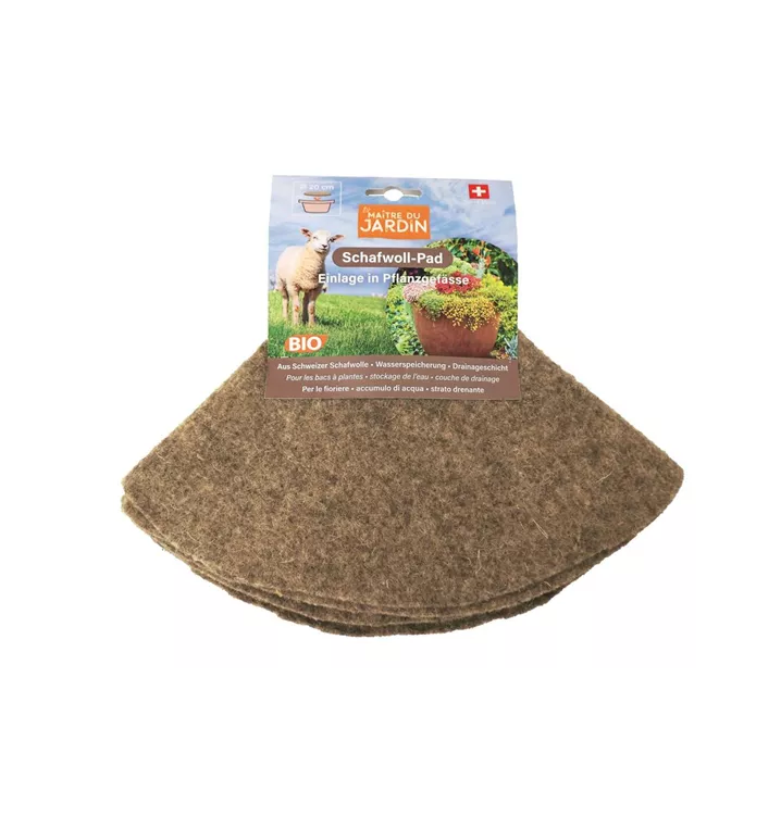 Die Pads aus Schweizer Bio-Schafwolle werden zur Wasserspeicherung und als Drainageschicht unten in Pflanzgefässe eingelegt. Schafwolle ist ein nachwachsender und somit nachhaltiger Rohstoff. Produziert aus gewaschener Schweizer Schafwolle – zu 100% biologisch abbaubar. Hergestellt und verpackt in einer sozialen Institution.