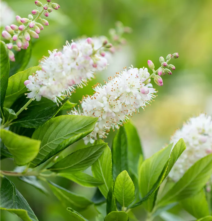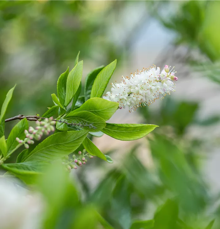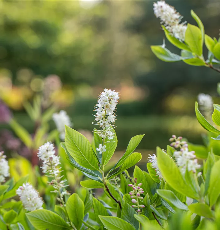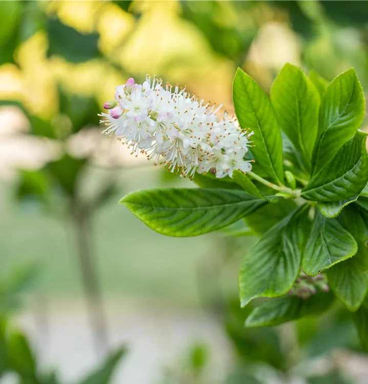 Blüte; weiss, aufrechte 15cm lange Trauben, duftend, Juli-Sept. - Blatt; schmaleiförmig -10cm - Wuchs; oval bis rundliche Form -2m