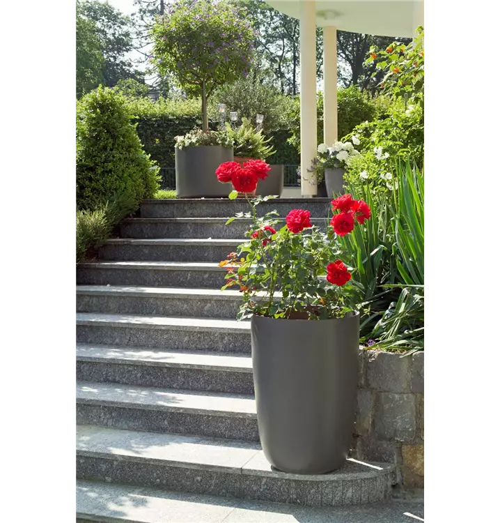 Die hohe und eckige Statur von Samurai ist das passende Pflanzgefäss für tiefwurzelnde Pflanzen wie Rosen oder Rosmarin. Im Aussenbereich oder auf der Terrasse verleiht Samurai eine zeitlose Eleganz und kann auf Grund der Höhe und Form auch sehr gut mit Geisha kombiniert werden.