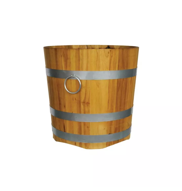Dieser Pflanzkübel überzeugt nicht nur optisch. Das Akazienholz wird in klassischer Küfertechnik gefügt. Die Form ist zeitlos und funktional.