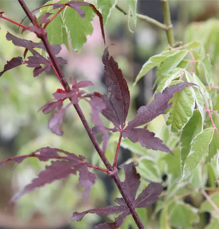 Pflanzenhöhe n. 10 Jahren 200 cm. Die Blattfarbe ist braunviolett, neue Triebe rot.