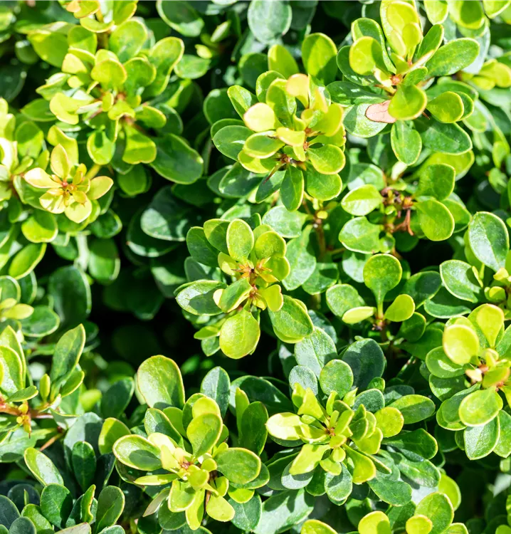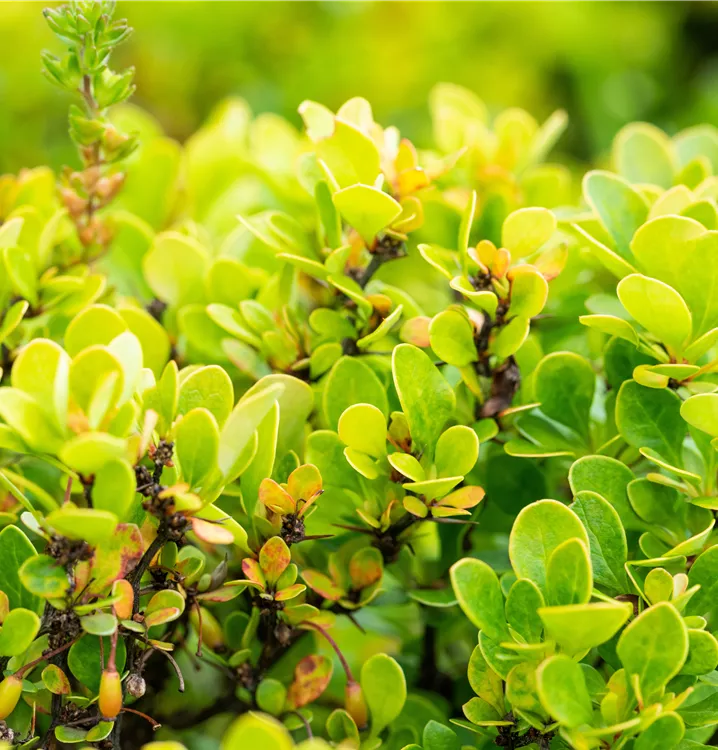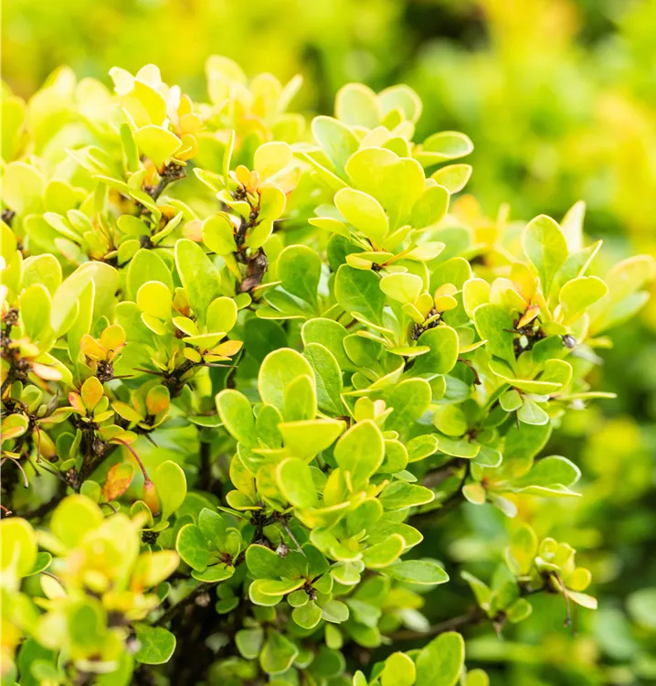 Blatt; grün, eiförmig, im Austrieb rötlich - Blüte; gelb aussen rötlich Mai - Wuchs; kugelig, dichtverzweigt -0,5m