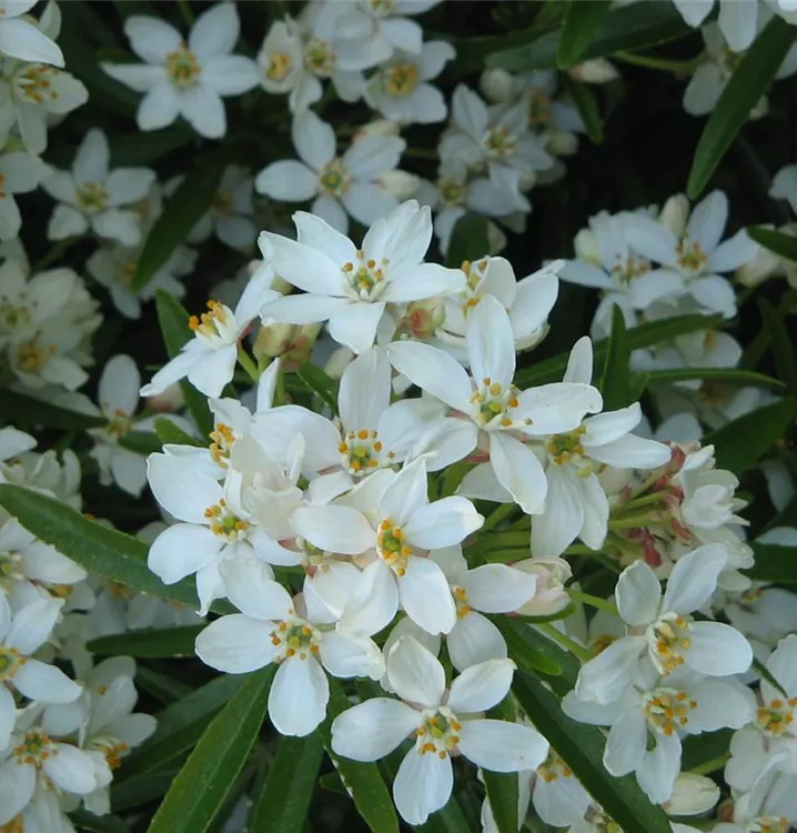 Eine sonnige bis schattige Lage ist perfekt für die Orangenblume 'Aztec Pearl', besonders wenn der Boden dort durchlässig, humos und nährstoffreich ist. Dann entwickelt sie sich zu einem buschigen und dichten Strauch und erreicht bis zu 1 m Höhe und 60 cm Breite.