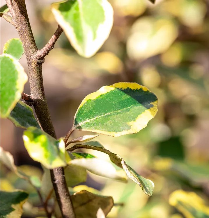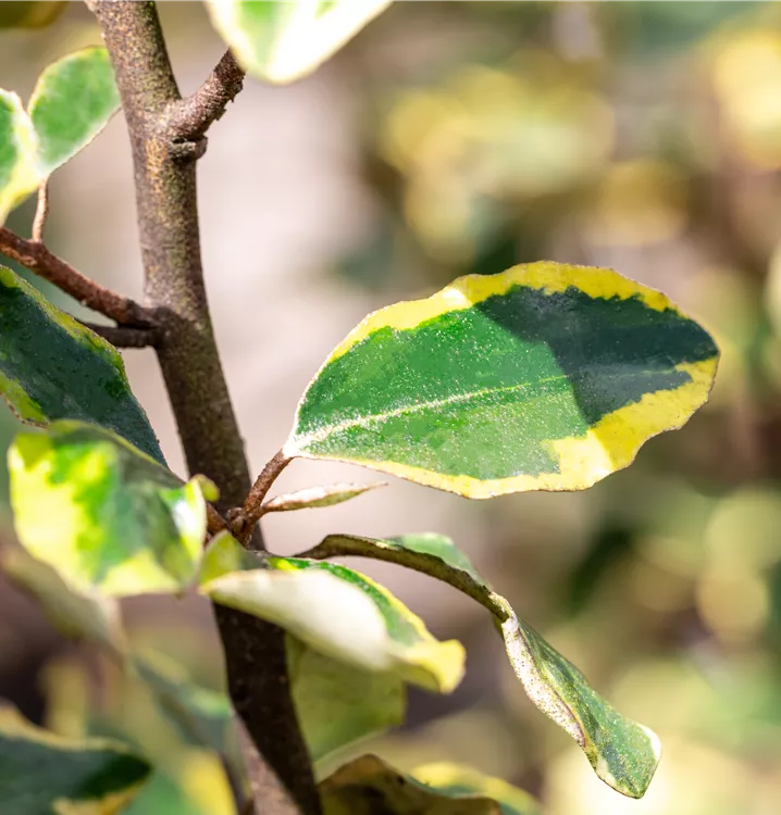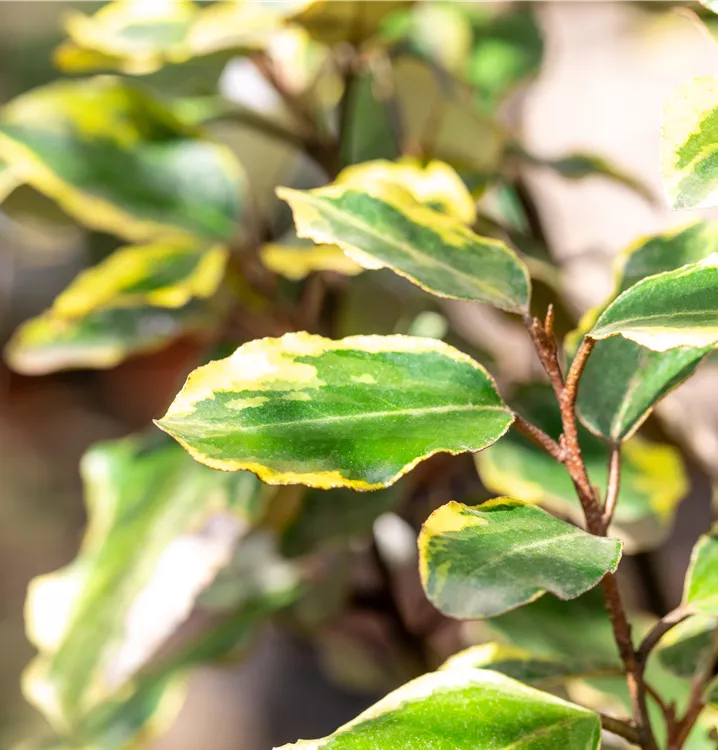 Strauch, immergrün, Laub gelbgefleckt, Blüte weiss, Oktober - November, bis 3 m, halbschattig - schattig, geschützt,