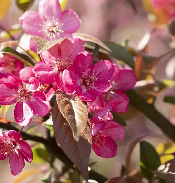 Baum, Laub grünrot, im Herbst orange-rot, Blüte weinrot, halbgefüllt, Blütezeit Mai, bis 6 m (20-40 cm pro Jahr), sonnig, Frucht tiefrot, Solitär, widerstandsfähig gegen Feuerbrand und Apfelschorf, selten Mehltau.