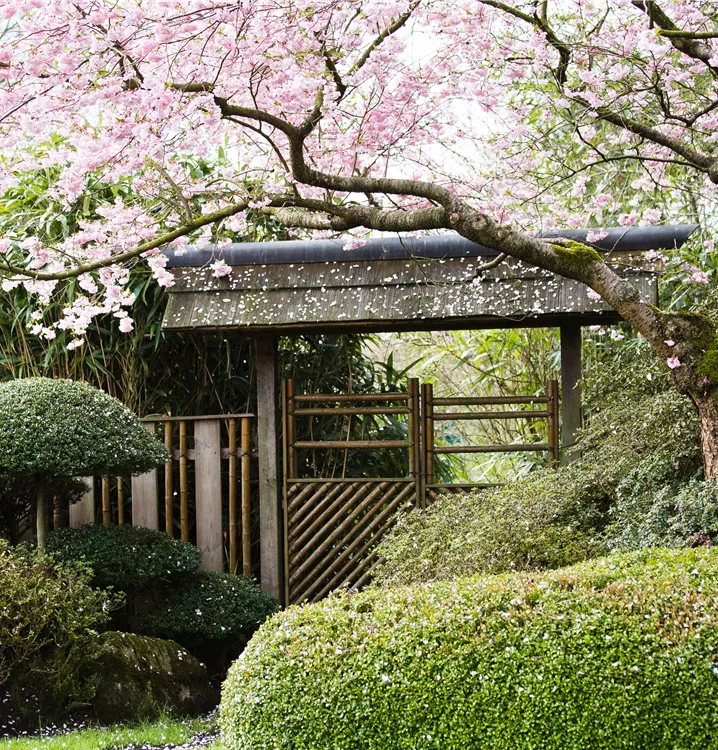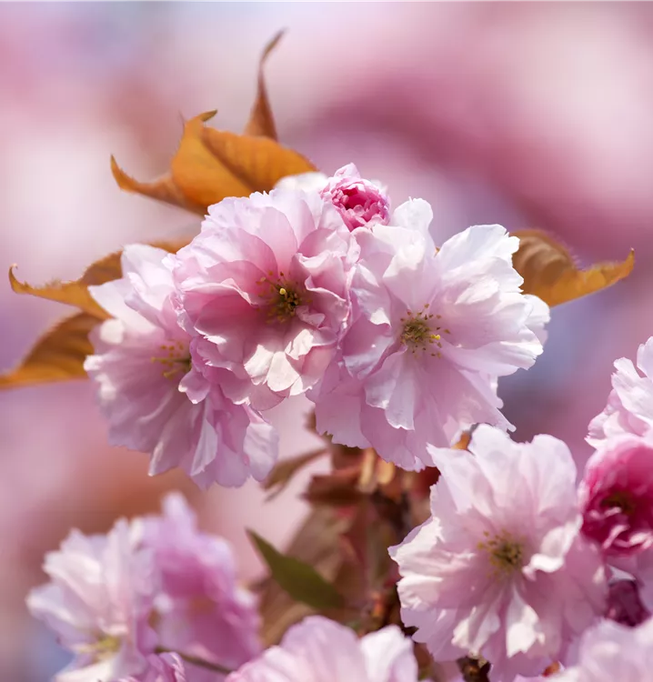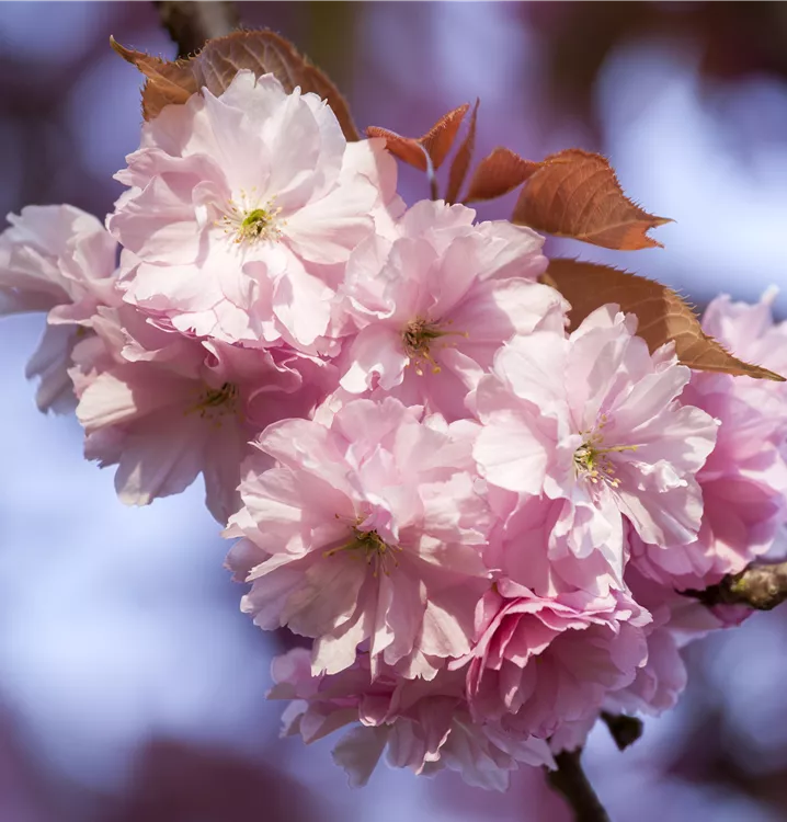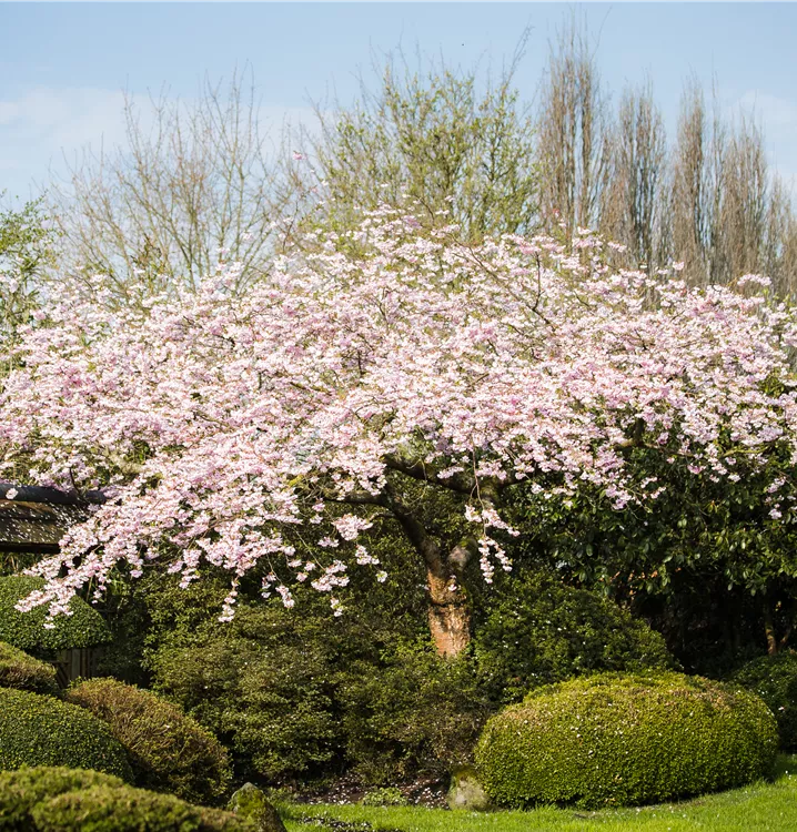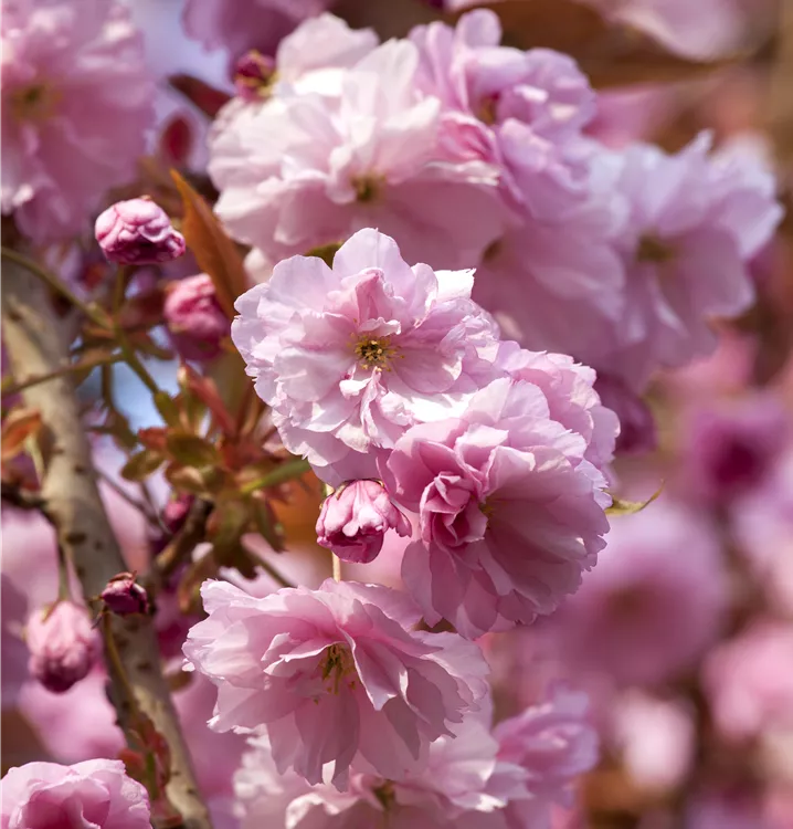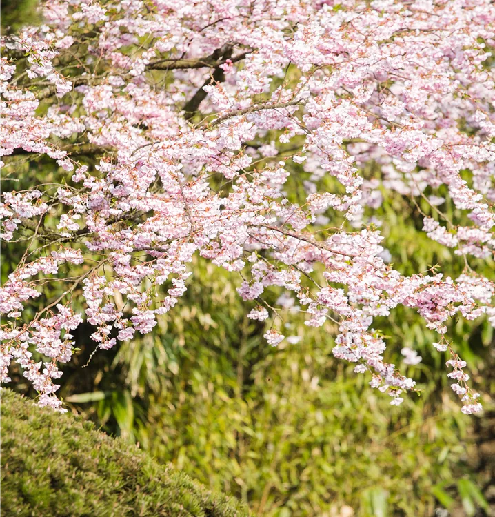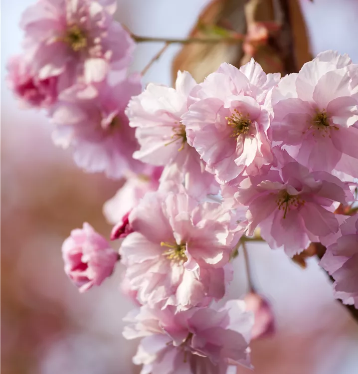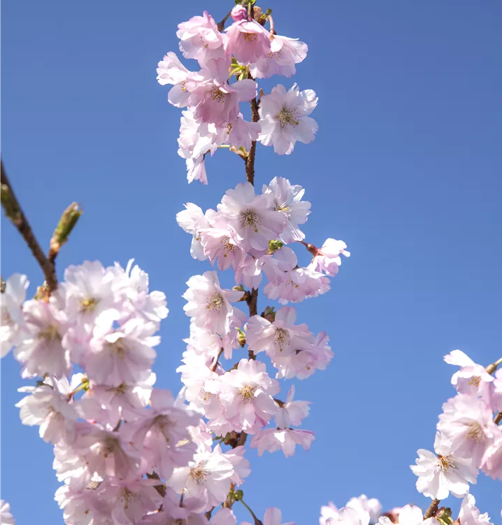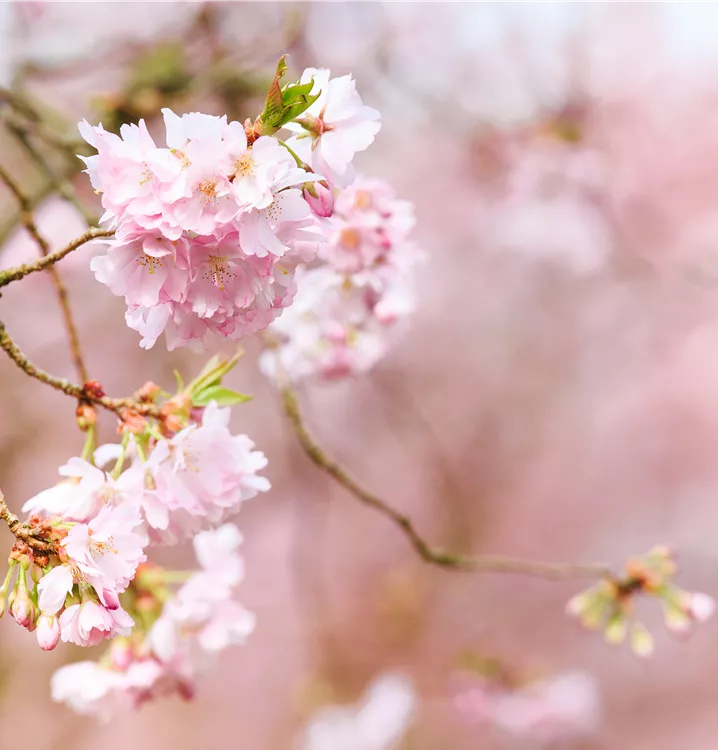 Zierkirsche blüht sehr früh in zartrosa Büscheln,