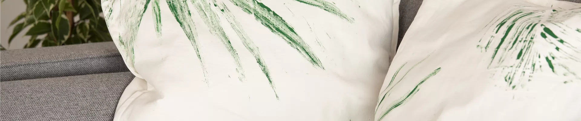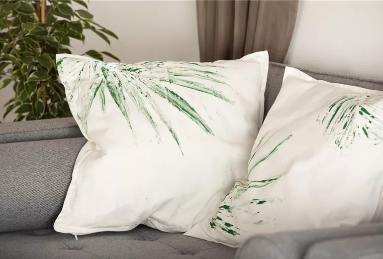 Besonders schön machen sich besondere Blätter auf Textilien im Wohnzimmer. Kissen lassen sich im Handumdrehen von schlichtem Weiss in ein dekoratives Kissen mit Pflanzenmuster verwandeln. Und das super einfach, schnell und günstig.