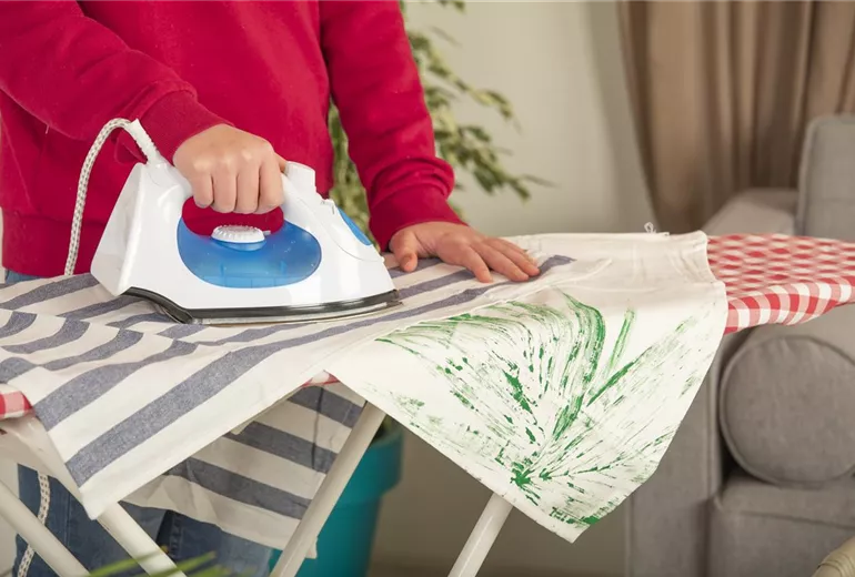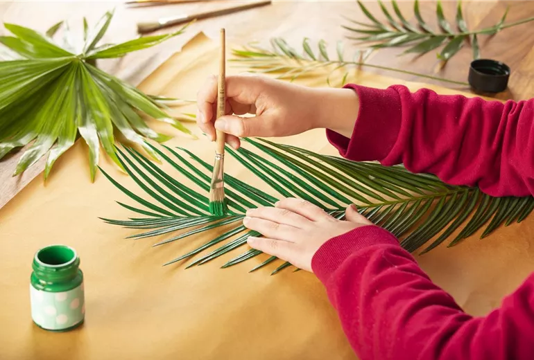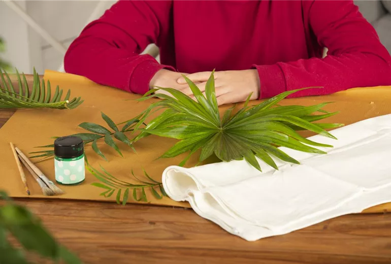 Sofakissen bekommen mit einem aussergewöhnlichen Muster ein ganz besonderes Aussehen. Dafür eignen sich am besten einfarbige Kissenhüllen, da das bedruckte Muster ja später im Vordergrund stehen und nicht untergehen soll. Je nach Einrichtung und Vorlieben können das weisse, schwarze oder andersfarbig Kissenhüllen sein. Wichtig sind aber die Hüllen, da diese später gebügelt werden müssen. Die Auswahl der Blätter ist riesig. Monstera, Kentia-Palme und Co. haben jede Menge aufregende Muster und Strukturen zu bieten und eignen sich für den Druck besonders gut. Dazu kommt noch Textilfarbe in der gewünschten Farbe und ein Pinsel und ein Bügeleisen.