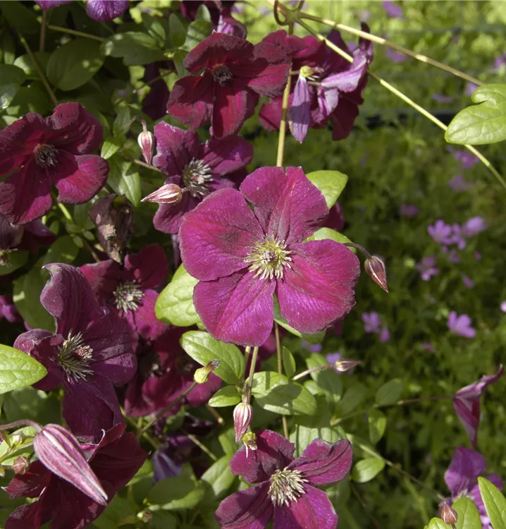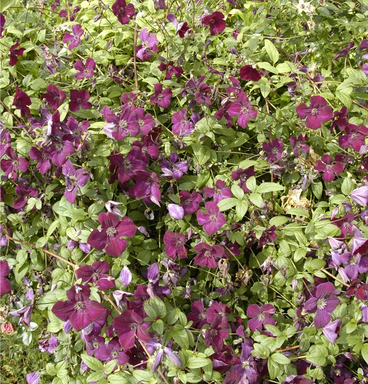 Kletterpflanze, Blüte dunkelrot, Juni - Setember, sonnig - halbschattig, bis 3 m, Kletterhilfe, Einzelstellung, Terrasse,