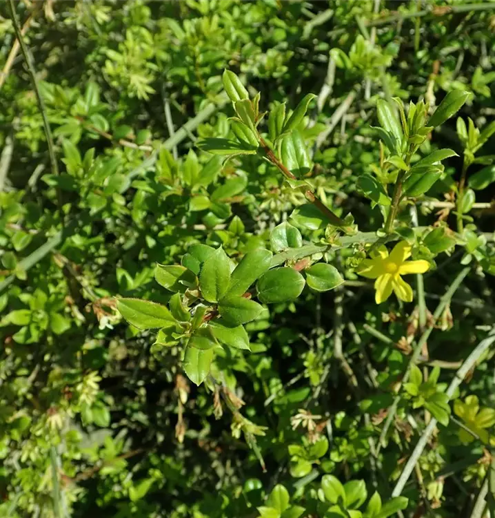 Der Strauch hat einen lockeren, überhängenden Wuchs. Bei einer Grösse von 3 m ist der Echte Winter-Jasmin etwa 3 m breit.