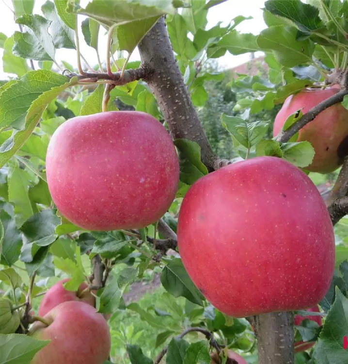 Frucht: mittelgrosser runder Apfel, l.rot marmoriert, sehr süss, fruchtiger Geschmack nach Mango/Banane, knackig fest