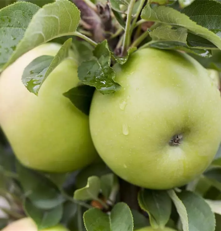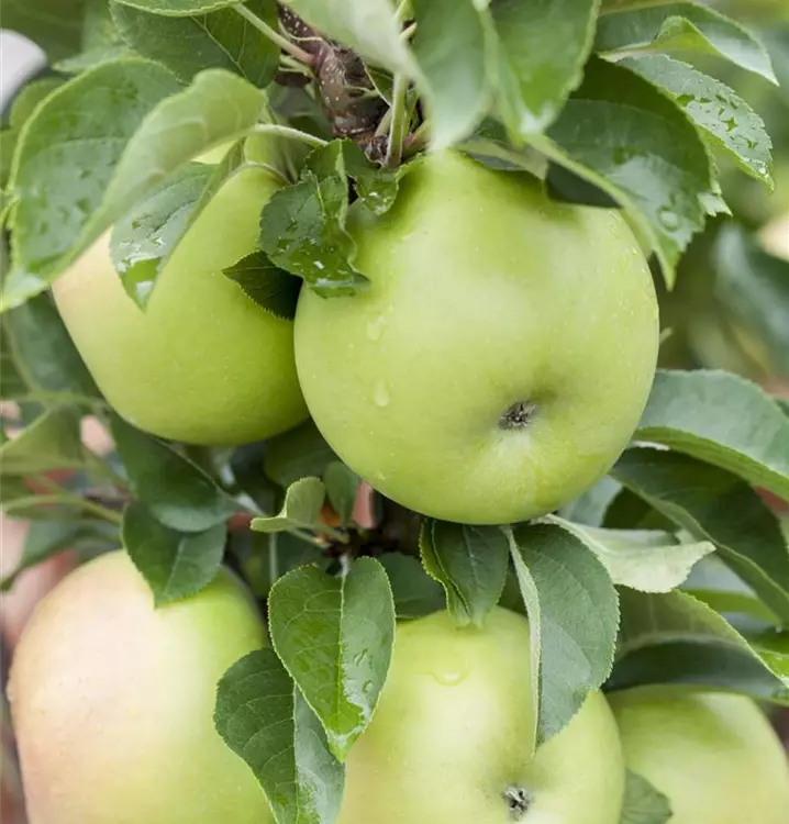 Wuchs stark, kompakt, säulenförmig, Frucht gross, kugelförmig, Schale glatt ohne Berostung, grüngelb, knackig, sehr saftig, spritzig.