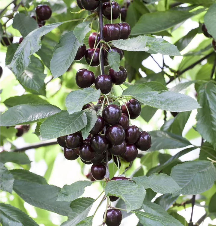 Die Süsskirsche 'Narana' (Prunus avium) bildet dunkelrote, grosse, mittelfeste Früchte. Sie sind oval und haben einen süssen, aromatischen Geschmack. Für eine ertragreiche Ernte ab Mitte Juni schaffen durchlässiger, kalkhaltiger, nährstoffreicher Boden und ein sonniger bis halbschattiger Standort optimale Bedingungen. Auch ihre weissen, angenehm duftenden Blüten sind eine schöne Erscheinung.