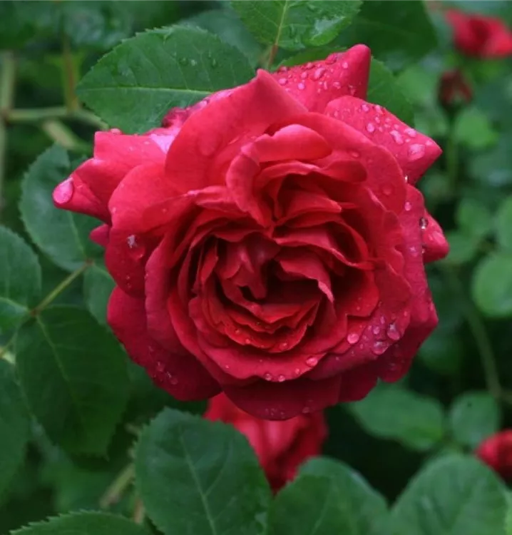 Blüte: dunkel karmesinrot bis purpurrot – grosse, rosettenförmige Blüten – intensiver Duft.