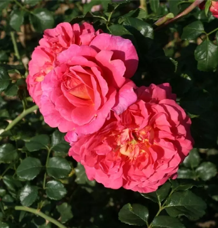Blüte: intensives Orangerot – äussere Blütenblätter beim Abblühen lachsrosa – rosettenförmig – angenehmer, zitroniger Teerosenduft.