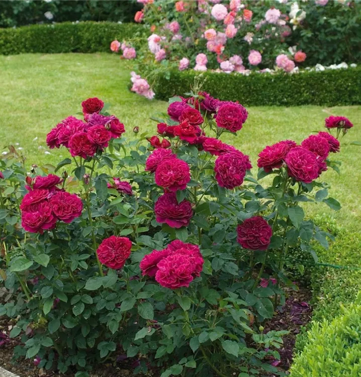 Blüte: tiefes, sattes Karmesinrot - mittelgross - wunderschöne Rosette - fruchtiger Duft. Pflanze: buschiger Wuchs - gesund - blühwillig - 100 cm hoch.