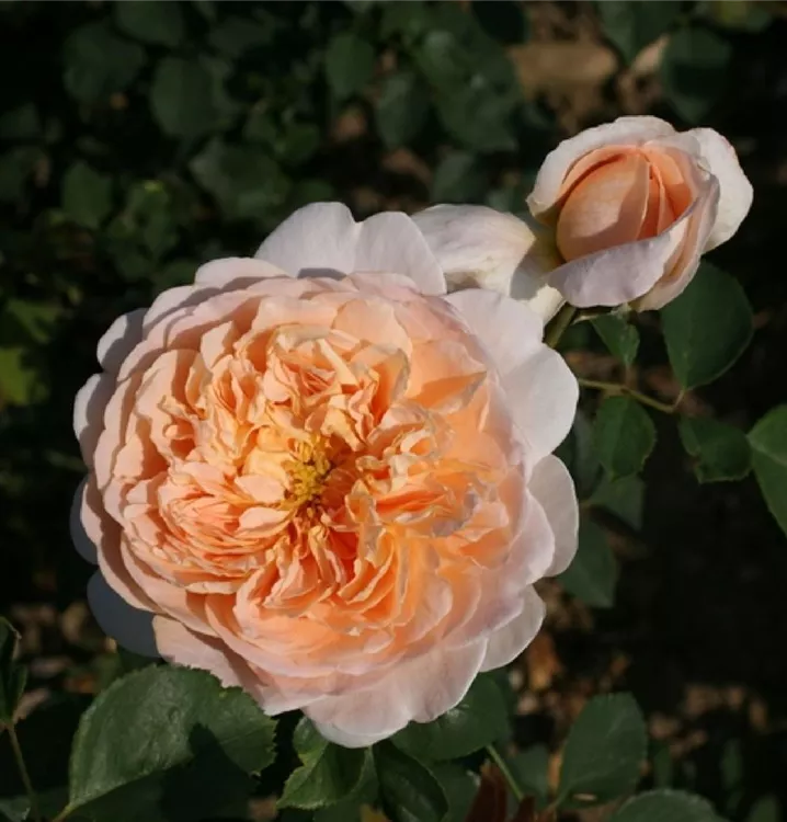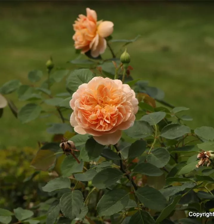 Blüte: sattes Apricot - lockere Rosettenform - fruchtiger Duft. Pflanze: ziemlich aufrechter Strauch - fast stachellos - sehr gesund - 120 cm hoch.