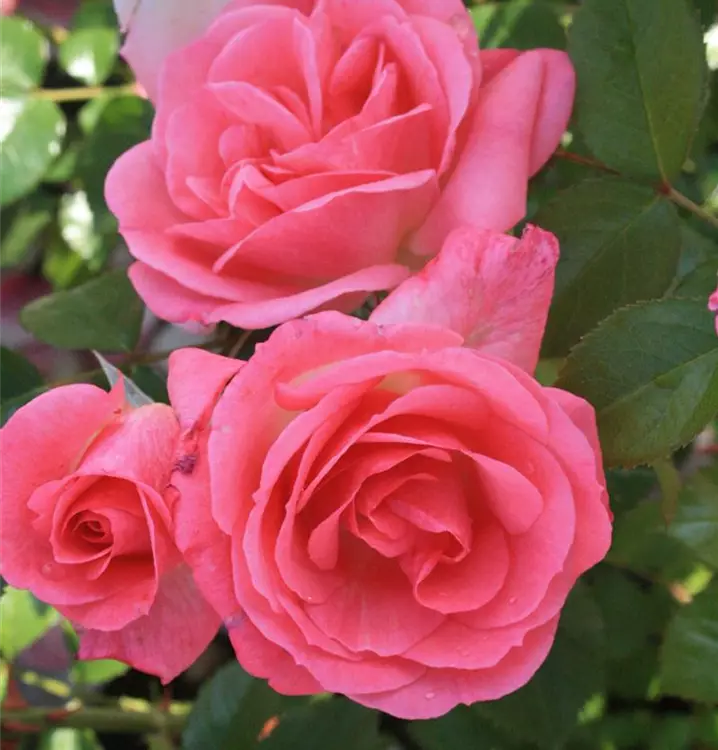 Blüte: schlanke, elegante Knospen – warmes, klares Rosa auf weissem Grund– schön geformte, gut gefüllte Blüten – leichter Wildrosenduft.