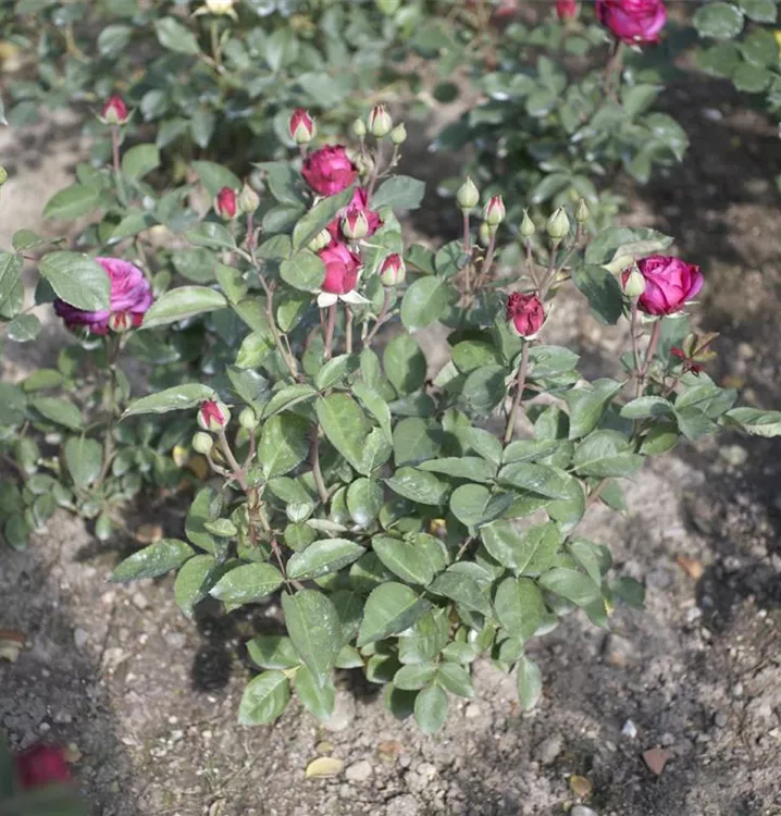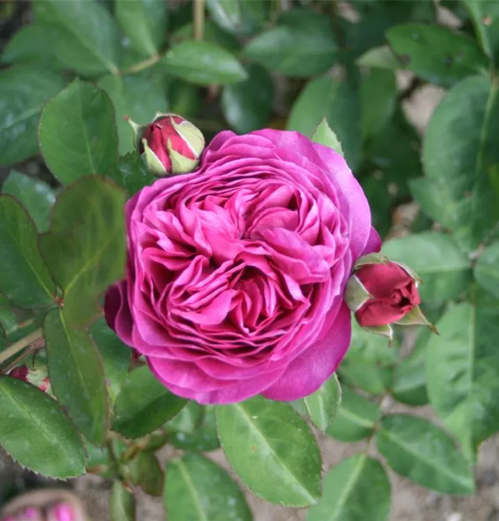 Blüte: violettfarbig –stark gefüllt – 6 bis 9 cm Durchmesser – edelrosenähnlich – nostalgische Form – berauschender Duft.