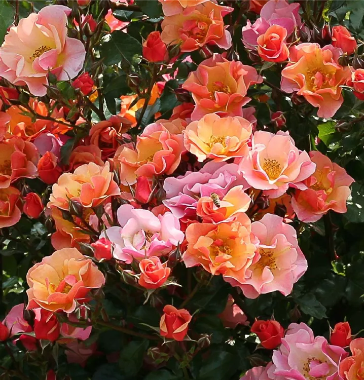 Blüte: kupferorange bis pfirsichgelb - 5 bis 10 Blütenblätter - 3 bis 4 cm Durchmesser. Pflanze: lockerer, aufrechter Wuchs - gute Selbstreinigung - hoche Resistenz gegen Mehltau und Sternrusstau - 60 bis 70 cm hoch.
