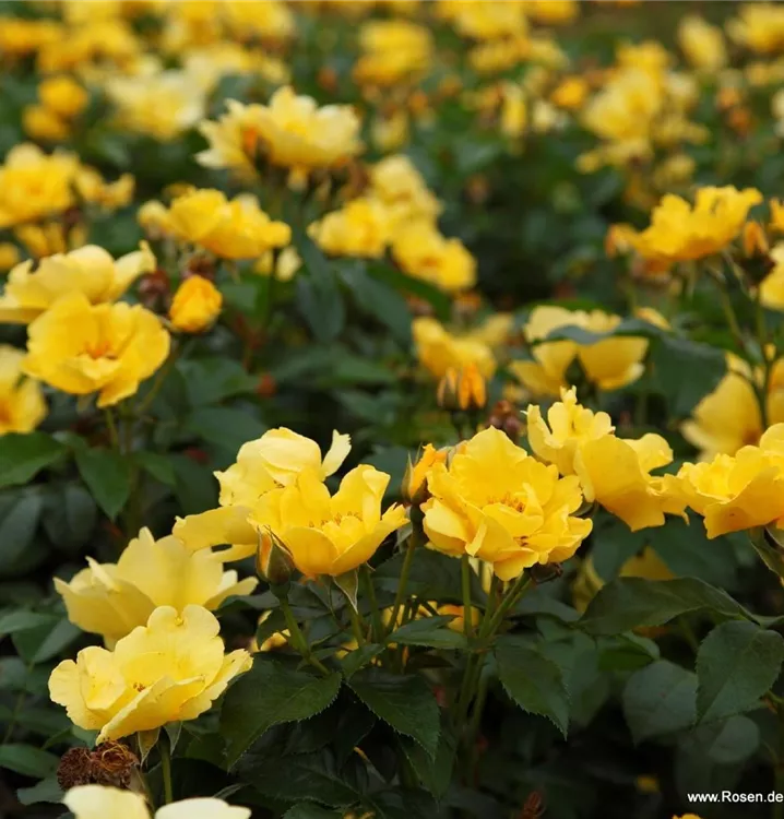 Blüte: leuchtendes Sonnengelb – halbgefüllte, schalenförmige, mittelgrosse Blüten – zarter Duft. Pflanze: dunkelgrünes Laub – 60 bis 90 cm hoch.