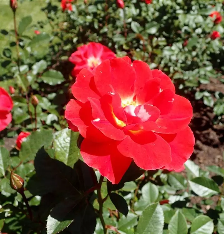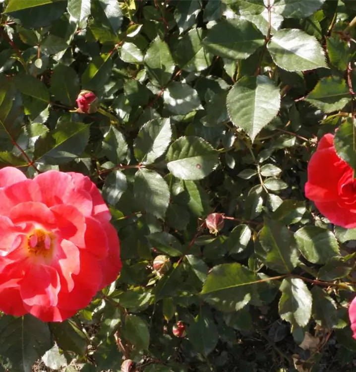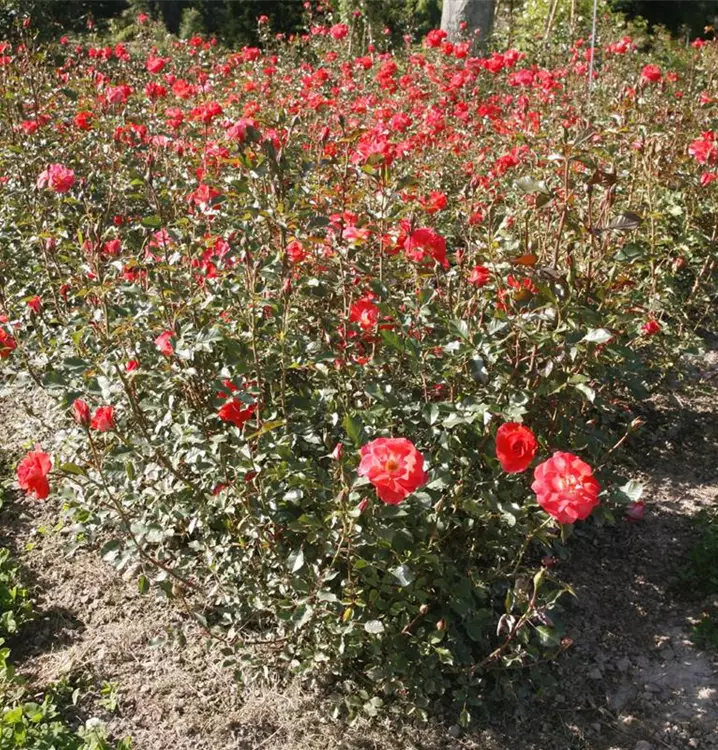 Diese Floribundarose wächst aufrecht und buschig mit einer Wuchshöhe von 70–90 cm und einer Wuchsbreite von etwa 50–60 cm. Von Juni bis Oktober zeigt sie eine anhaltende, reiche Blüte mit guter Nachblüte. Das dunkelgrüne Laub unterstreicht die kräftige Blütenfarbe und sorgt für ein gepflegtes Gesamtbild.