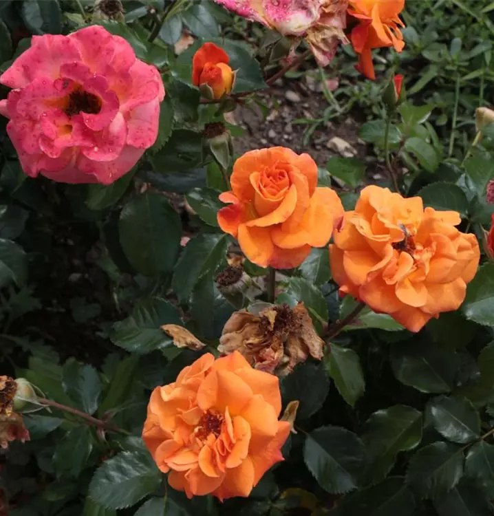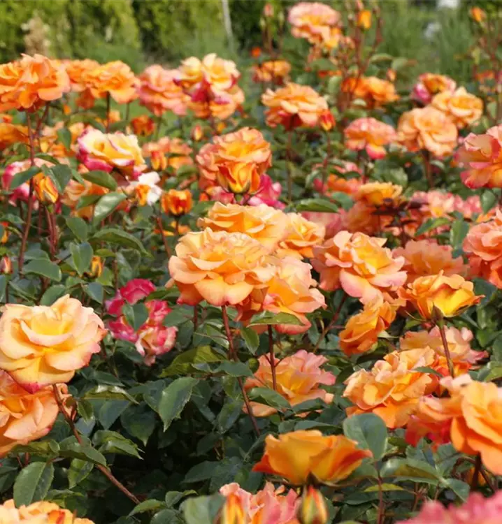 Die elegant gefüllten Blüten erscheinen in üppigen Dolden und strahlen in Schattierungen von Apricot bis Orange.