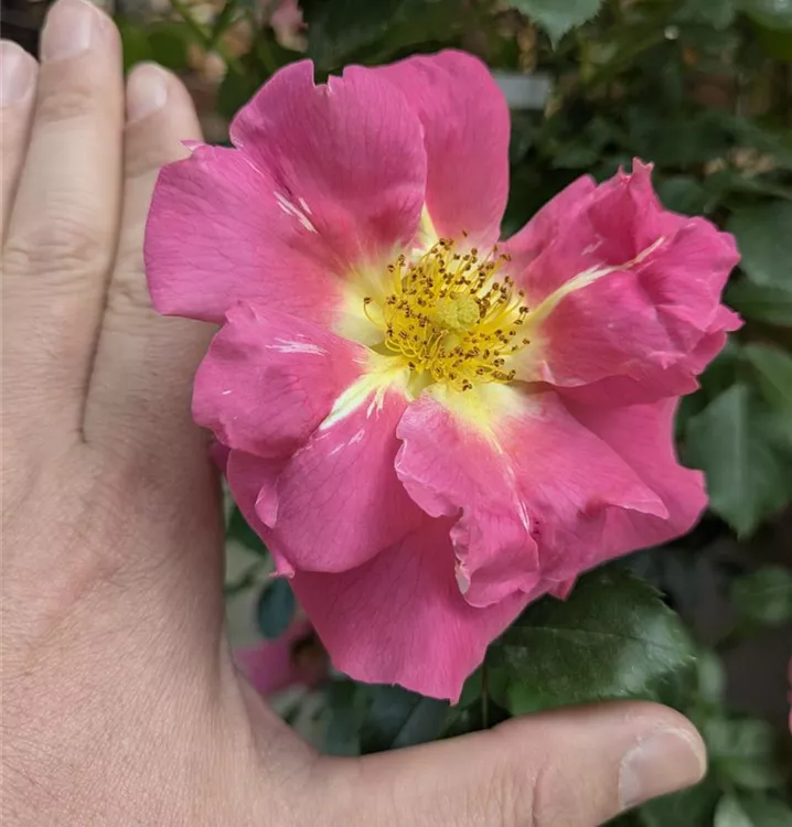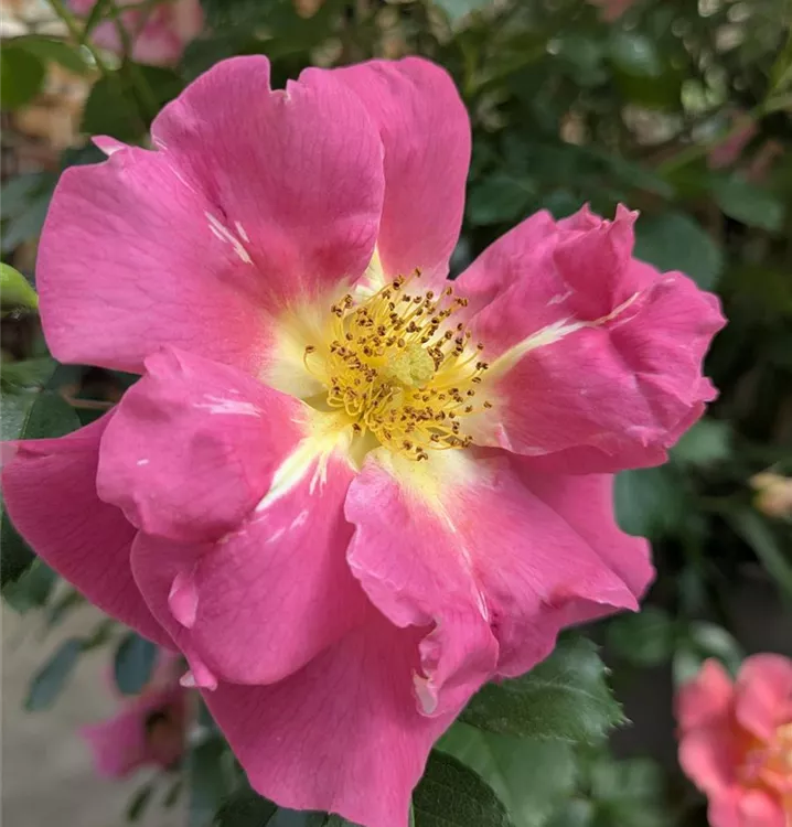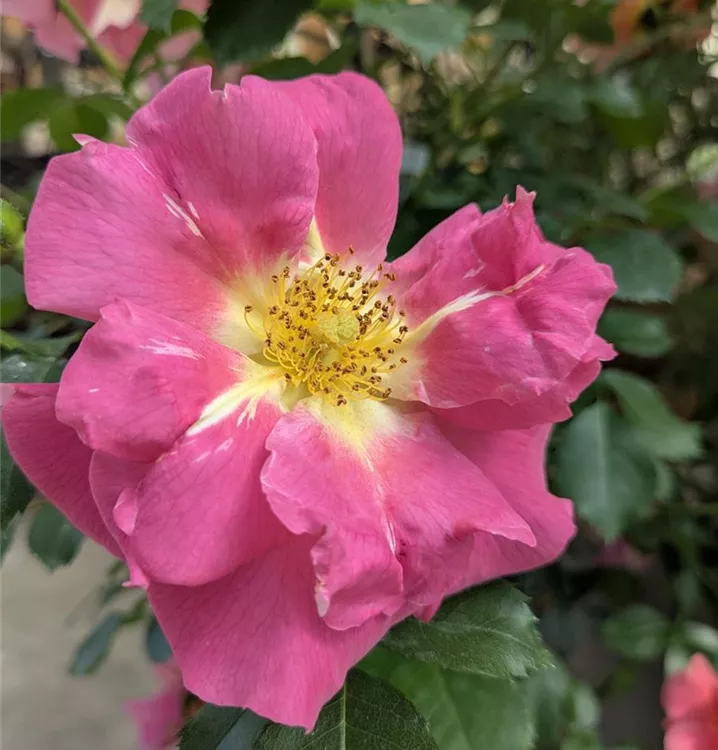 Blüte: orangerosa bis dunkelrosa mit gelber Mitte – reiches Farbenspiel – leichter Duft – halb gefüllt – mittelgross.