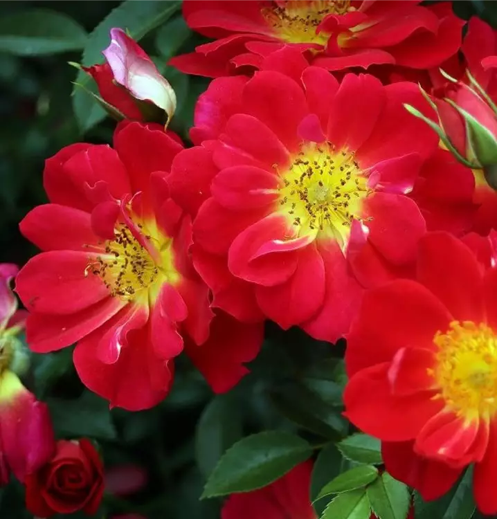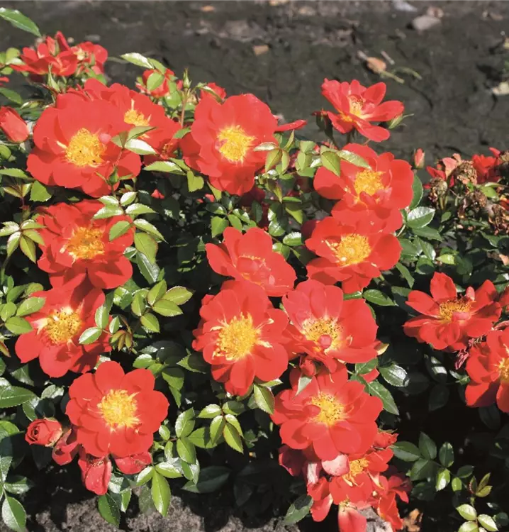 (Rosen Tantau 2013) Halbgefüllte hellrote Blüten mit schöner gelber Mitte. Das reiche Pollenangebot wird gerne von Honigbienen genutzt. Der Wuchs ist kompakt buschig, feintriebiger Aufbau. Die Blüten haben eine herausragende Leuchtkraft und sind gut selbstreinigend.