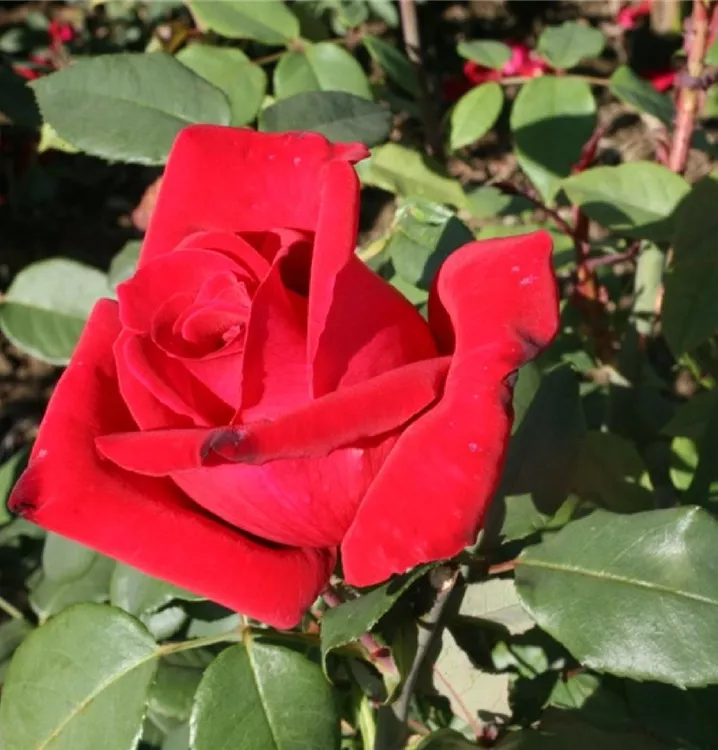 Blüte: dunkelrot - üppige Blütenfülle - grosse Blumen - einzeln und in Büscheln blühend - sauber verblühend - duftend.