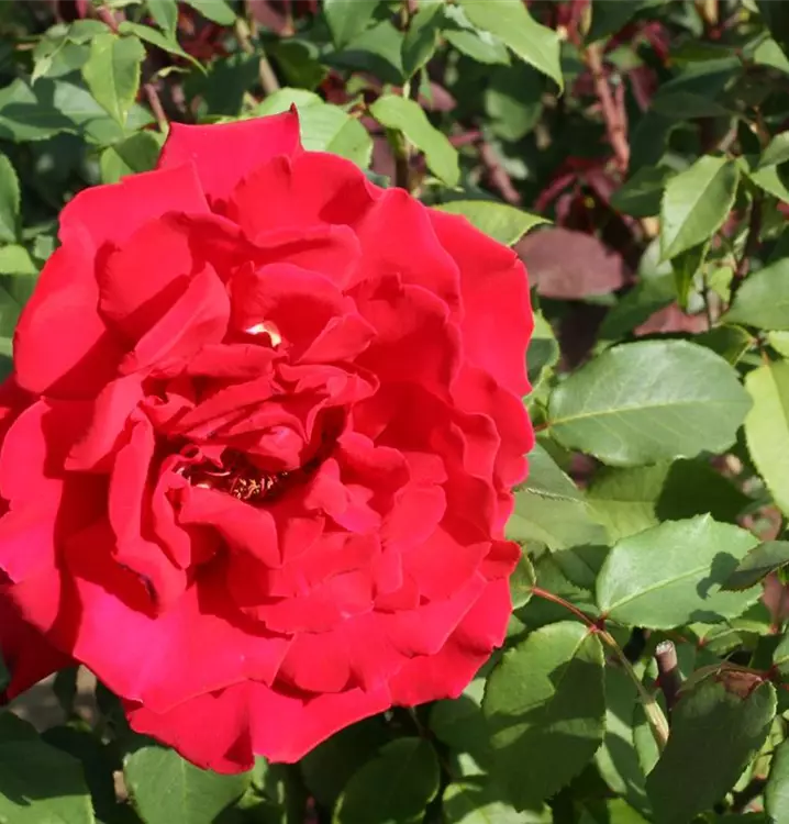 Rosa 'Erotika'® ist eine wahre Schönheit: Ihre intensiven kirschroten Blüten mit goldgelbem Zentrum erscheinen im Sommer und sorgen bis in den Herbst hinein für einen faszinierenden Anblick. Die Blüten sind stark gefüllt und verströmen einen intensiven, fruchtigen Duft, der sie zu einer beliebten Schnittrose macht.