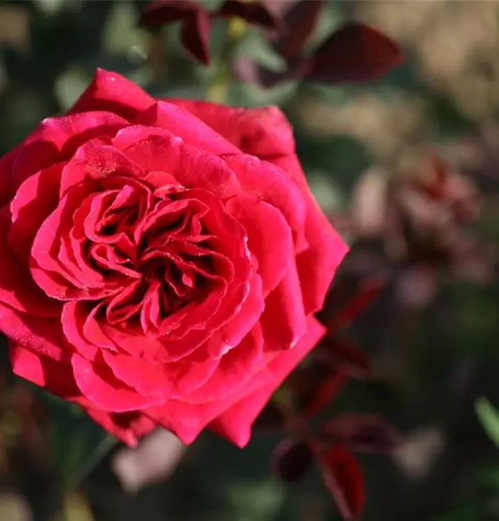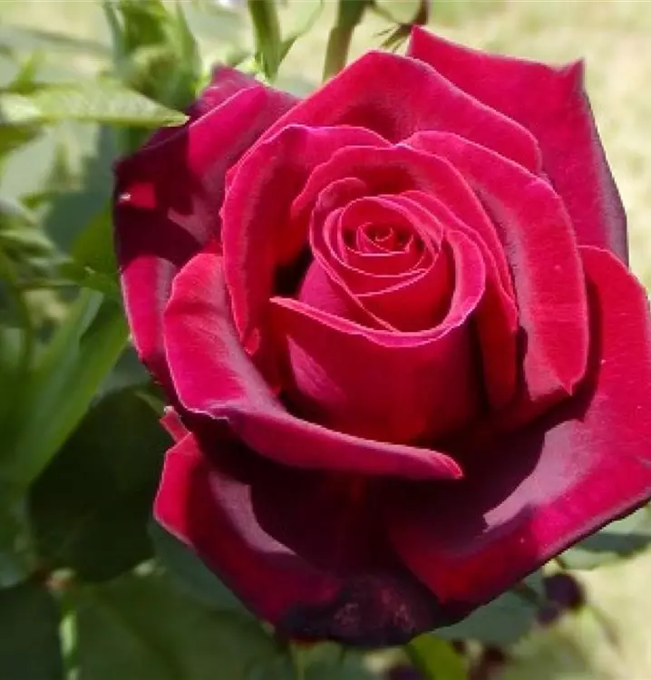 Blüte: tiefes Dunkelrot mit Purpurschimmer – mittelgross – gut gefüllt – lieblicher Duft.