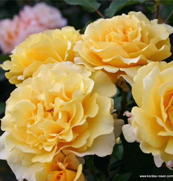 Blüte: honiggelb – gefüllte, schalenförmige Blüten – zarter Duft. Pflanze: aufrechter, schlanker und kräftiger Wuchs – dunkelgrünes, gesundes Laub – 110-120 cm hoch.