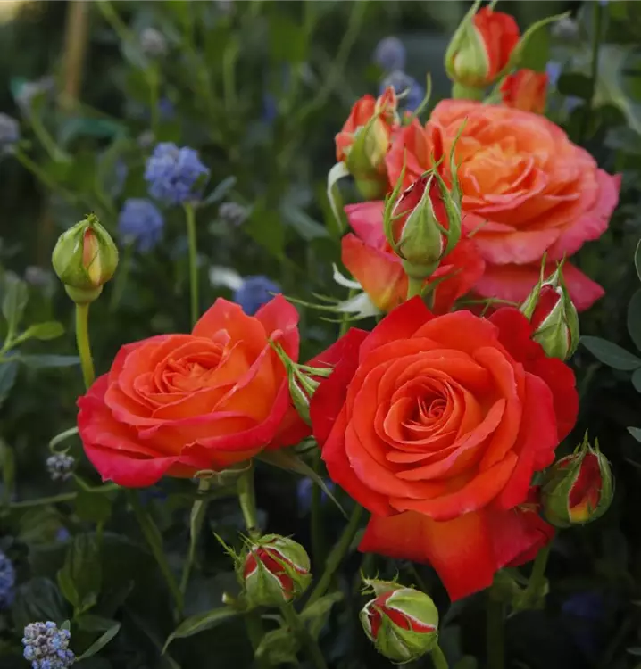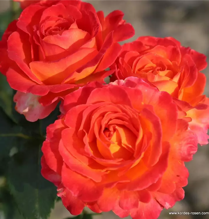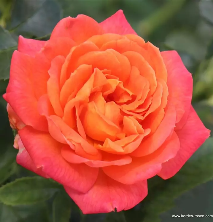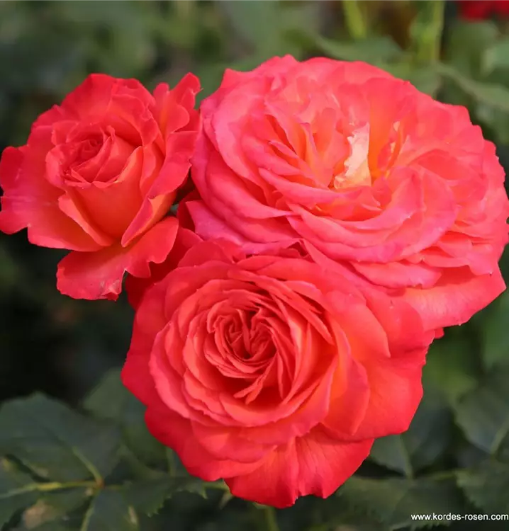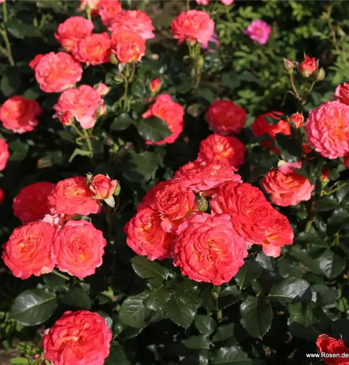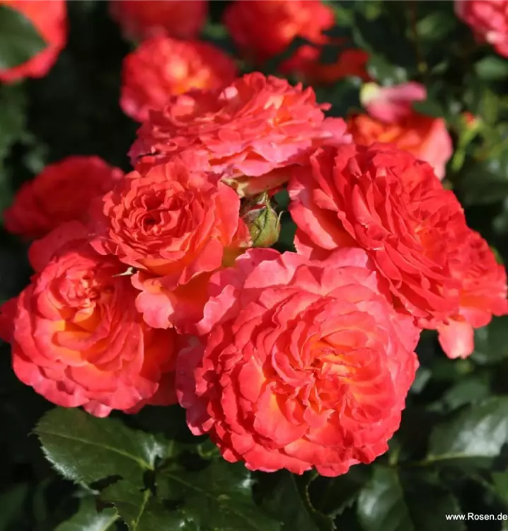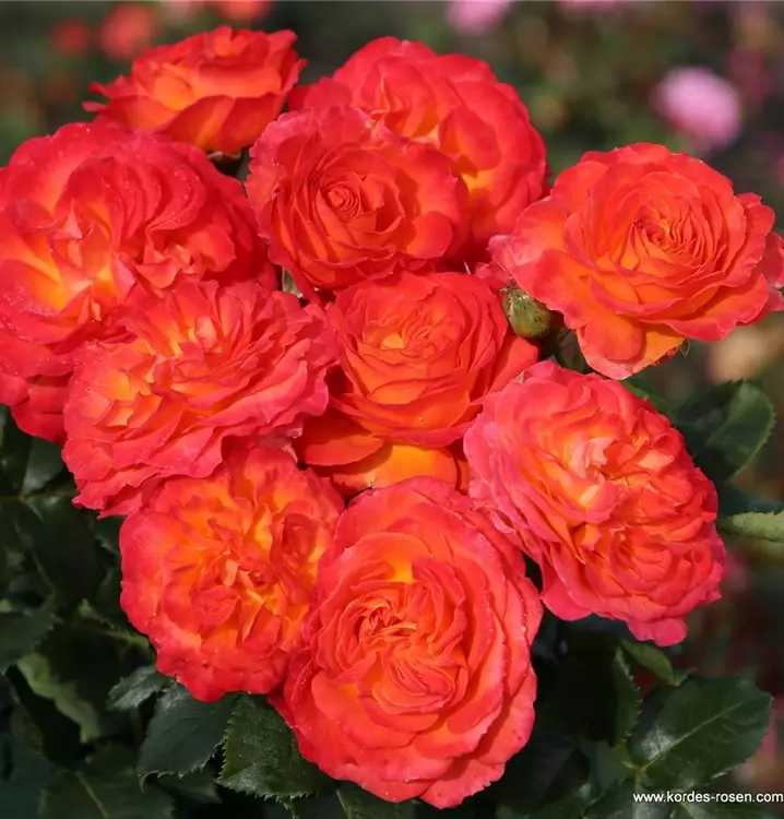 Blüte: kirschrotgelb – gefüllte, mittelgrosse Blüten – leichter Duft.