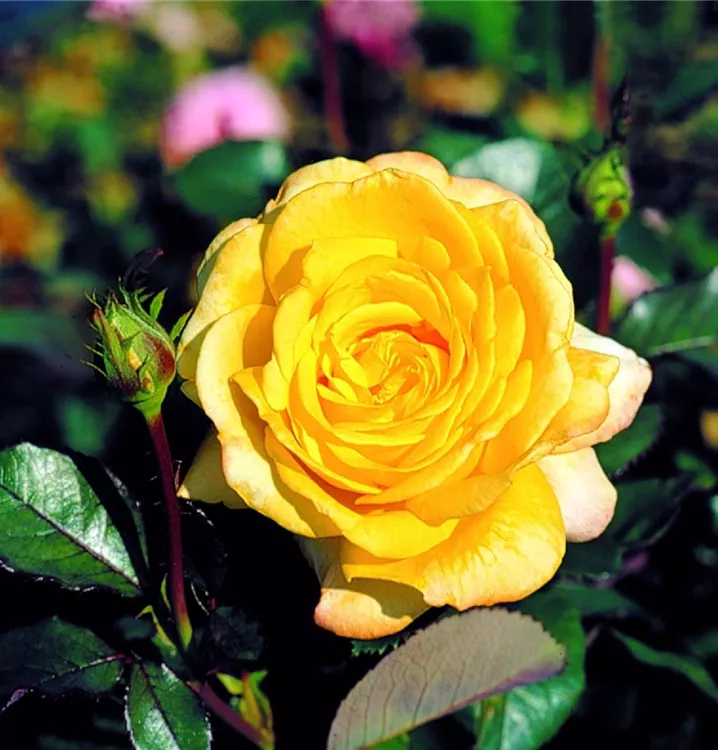 Blüte: Knospe geflammt rot, nach dem Aufblühen reines Sonnengelb – 23 bis 35 Blütenblätter – 13 cm Durchmesser – gut geformte Blüte – als Freilandschnittrose