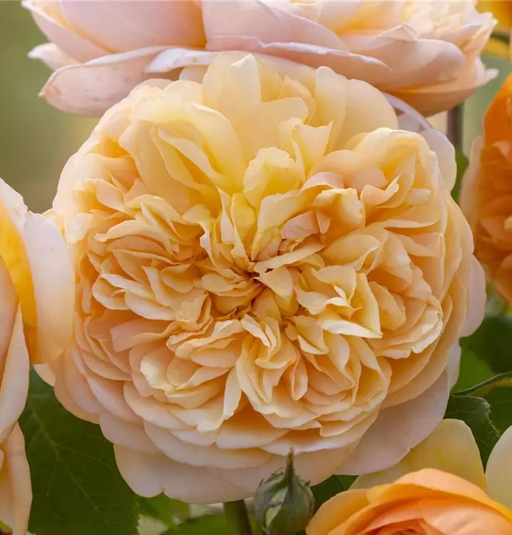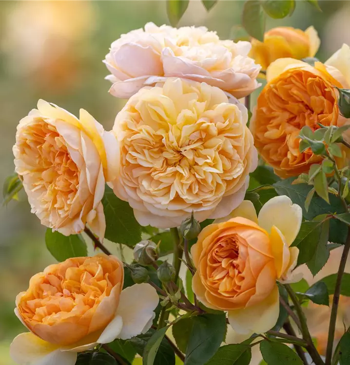 Die Englische Rose Bring Me Sunshine® begeistert mit grossen, dicht gefüllten Blüten in warmem Apricotgelb, die im Verlauf der Blüte etwas heller werden. Ihre eleganten Blüten erscheinen in kleinen Büscheln und sorgen während der ganzen Saison für eine lange Blütezeit im Garten. Durch ihren kompakten Wuchs eignet sich diese Sorte besonders gut für Beete, Rabatten oder kleinere Gartenbereiche.