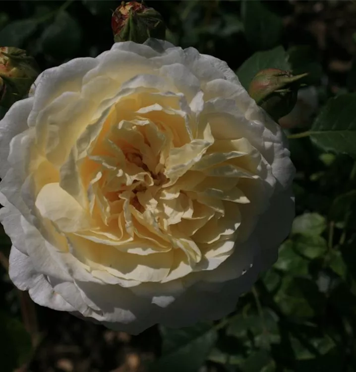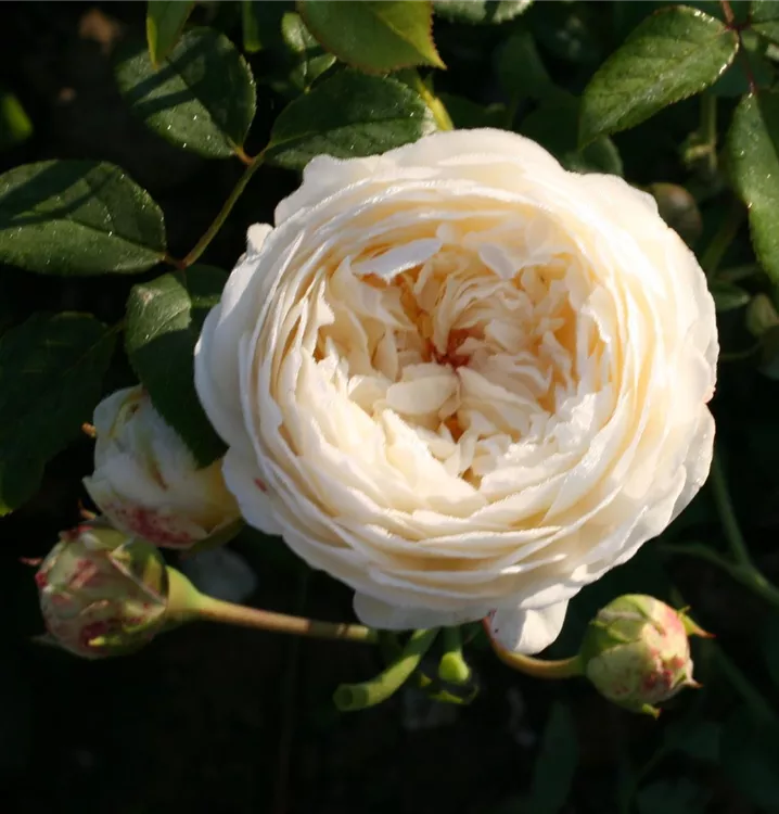 ‘Claire Austin’® ist eine der charmantesten englischen Kletterrosen. Ihre grossen, reinweissen Blüten sind dicht gefüllt, öffnen sich in perfekter Rosettenform und wirken wie kunstvolle Blütenkelche. Der Duft ist intensiv und komplex – mit Noten von Myrrhe, Vanille und einer Spur Zitrus, was sie zu einer der schönsten Duftrosen überhaupt macht.