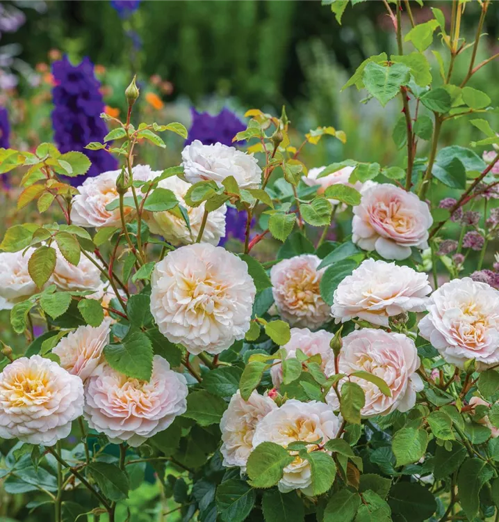 Von Juni bis in den Herbst hinein erfreut diese englische Rose mit einer Fülle an Blüten. Der Wuchs ist rundlich, kompakt und gleichmässig – ideal für Beete oder den Vordergrund grösserer Pflanzungen. Mit einer Höhe von ca. 110–130 cm und einer Breite von ca. 90 cm bleibt sie gut formbar und harmonisch. Das Laub ist mittelgrün, gesund und dicht.