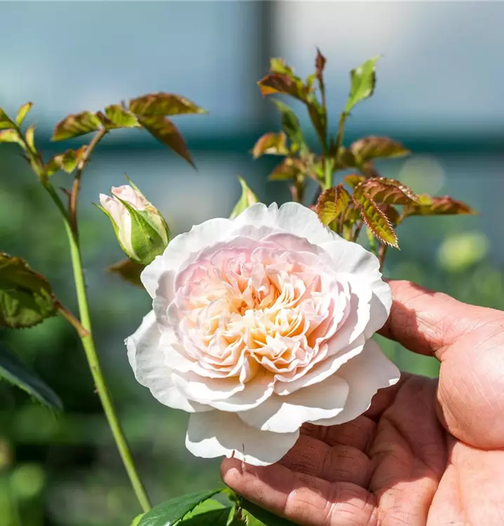 ‘Emily Brontë’® ist eine Rose voller Gefühl – benannt nach der bekannten englischen Schriftstellerin, deren Werke von tiefer Romantik und stiller Kraft geprägt sind. Ihre Blüten sind dicht gefüllt, rosettenförmig und zeigen ein zartes Apricotrosa im Inneren, das nach aussen hin fast cremefarben verblasst. Der Duft ist betörend – fruchtig mit Anklängen von Zitrus und Tee.
